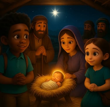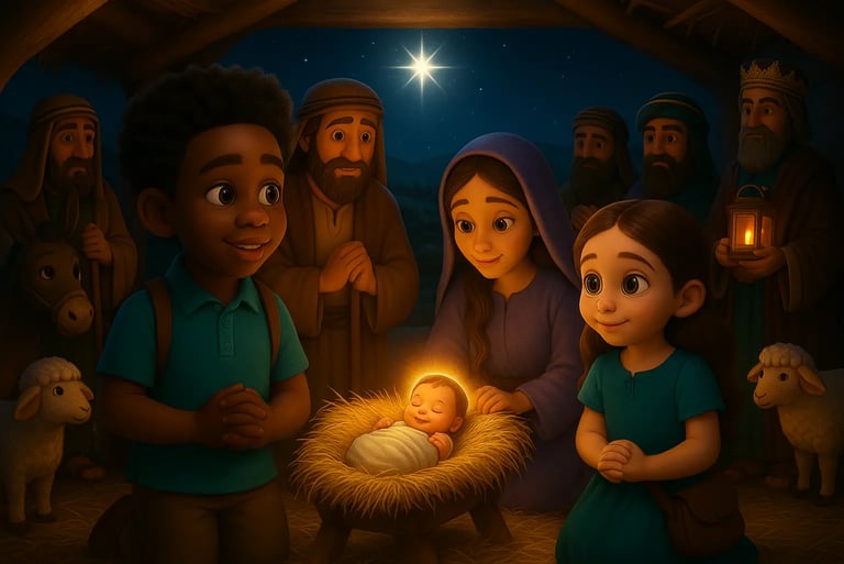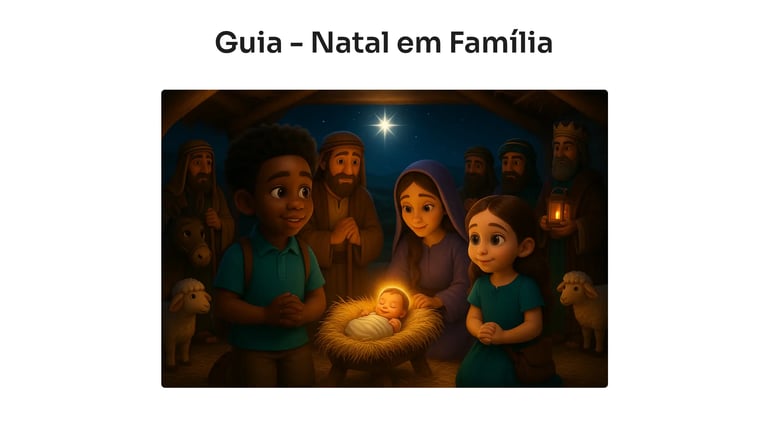 Seu filho vai viver a história completa do primeiro Natal — desde o anúncio do anjo a Maria até o nascimento de Jesus em Belém.